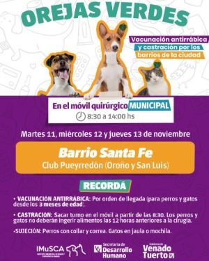 La Secretaría de Desarrollo Humano informa que el Instituto Municipal de Salud y Convivencia Animal (Imusca) estará con el programa gratuito “Orejas Verdes” en el barrio Santa Fe.