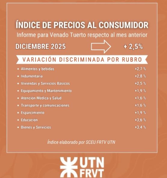 La inflación mensual correspondiente a diciembre 2025 en la ciudad de Venado Tuerto se ubicó en 2,5 %, registrando un leve incremento respecto de noviembre (2,3 %), acumulando así una suba interanual del 30,9 %.