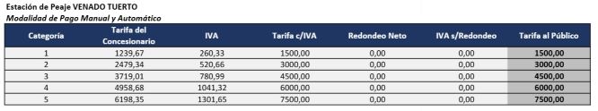 Para los vehículos de hasta dos ejes y hasta 2,30 metros de altura, categoría que engloba a la mayoría de los automóviles particulares, la nueva tarifa en rutas nacionales será de $ 1500. Las categorías superiores tendrán los siguientes montos: vehículos de hasta dos ejes y más de 2,30 metros de altura o rueda doble, $ 3000; y vehículos de tres o cuatro ejes hasta 2,30 metros de altura, montos aún no especificados en la información provista.
