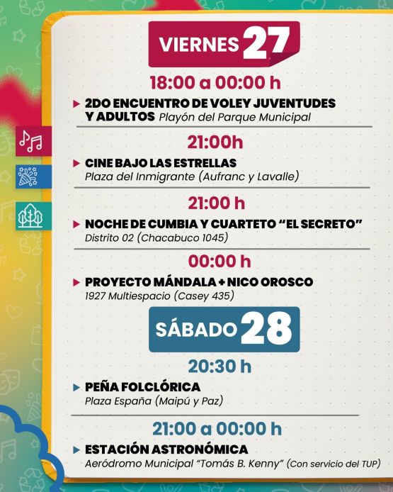En este último finde de febrero y primer domingo de marzo la ciudad ofrecerá una gran variedad de actividades para disfrutar en familia. Este viernes, se realizará en el playón principal del Parque Municipal “General Belgrano” el 2.º Encuentro de Vóley de Juventudes y Adultos. La competencia se desarrollará entre las 18 y la medianoche.