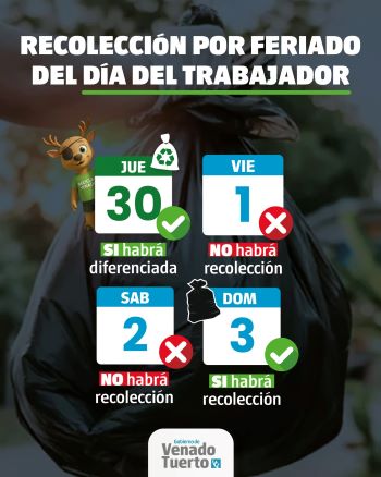 El Gobierno de Venado Tuerto a través de la Secretaría de Servicios y Obras Públicas informa a los vecinos el esquema de recolección de residuos domiciliarios con motivo del feriado por el Día Internacional de los Trabajadores.