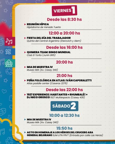 De 12 a 20, en la quinta del club Central Argentino (Eterovich y Alem), se realizará la Gran Fiesta del Día del Trabajador. Habrá espectáculos folclóricos, academias de danzas, emprendedores locales y servicio de bufé.