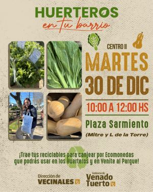 Este martes 30 de diciembre, de 10 a 12, el exitoso programa de la Dirección de Vecinales del Gobierno municipal “Huerteros en tu barrio”, realizará su último encuentro del año en la plaza Sarmiento (Mitre y Lisandro de la Torre).