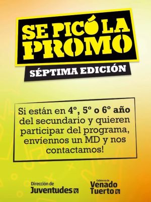 La Secretaría de Territorialidad y Desarrollo Cultural a través de la Dirección de Juventudes lanza la convocatoria para participar de la séptima edición de “Se Picó la Promo”, el programa del Gobierno de Venado Tuerto dirigido a estudiantes que están terminando sus últimos años (4.º, 5.º y 6.º) de nivel secundario.