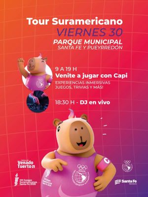 Rumbo a los Juegos Suramericanos 2026, Venado Tuerto será sede del Fan Fest itinerante los días jueves 29 y viernes 30 de enero, en el Parque Municipal General Belgrano, en el sector comprendido por Santa Fe y Pueyrredón. La propuesta forma parte de una activación provincial que recorre los 19 departamentos santafesinos y podrá visitarse el jueves 29 de 9 a 13 y de 16 a 22, y el viernes 30 de 9 a 19, con actividades durante la mañana y la tarde.