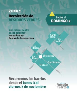 El Gobierno de Venado Tuerto, a través de la Secretaría de Servicios y Obras Públicas, informa el esquema de recolección de residuos verdes que se implementará del lunes 3 al viernes 7 de noviembre.