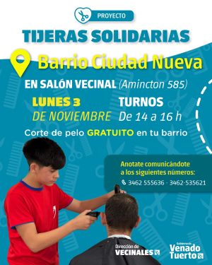 El próximo lunes 3 de noviembre el programa municipal “Tijeras Solidarias” llevará su servicio gratuito de corte de pelo para vecinos de diversas edades al barrio Ciudad Nueva.