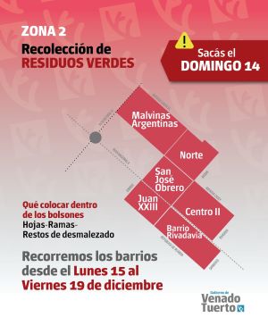El Gobierno de Venado Tuerto, a través de la Secretaría de Servicios y Obras Públicas, informa el esquema de recolección de residuos verdes que se implementará del lunes 15 al viernes 19 de diciembre.