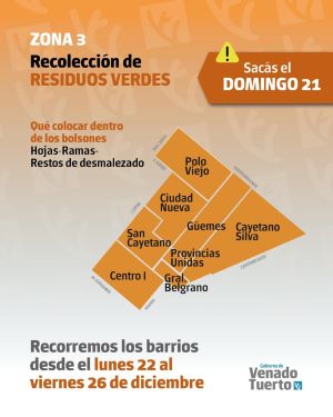 El Gobierno de Venado Tuerto, a través de la Secretaría de Servicios y Obras Públicas, informa el esquema de recolección de residuos verdes que se implementará desde el lunes 22 al viernes al 26 de diciembre.