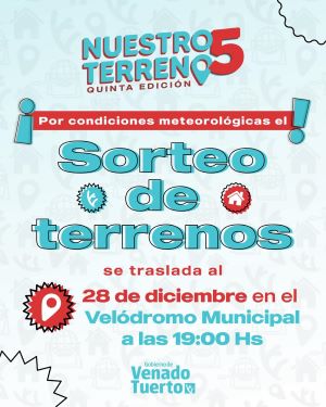 El Gobierno de Venado Tuerto anunció la suspensión del sorteo correspondiente a la quinta edición del programa "Nuestro Terreno", originalmente programado para el domingo 14 de diciembre en el Velódromo Municipal.