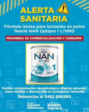 El Gobierno de Venado Tuerto, a través de la Dirección de Seguridad Alimentaria, emitió una alerta sanitaria por la fórmula láctea en polvo para lactantes Nestlé NAN Optipro 1/CHM.