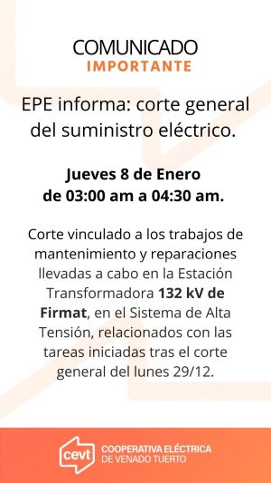 La Cooperativa Eléctrica de Venado Tuerto (CEVT) anunció la programación de nuevos cortes en el suministro eléctrico, motivados tanto por labores de mantenimiento en la red local como por trabajos de alta tensión que realizará la Empresa Provincial de la Energía (EPE). Este anuncio se produce tras un corte previo, entre las 3 y las 4:30 de la madrugada, que también fue programado por la EPE para realizar tareas en el sistema eléctrico.
