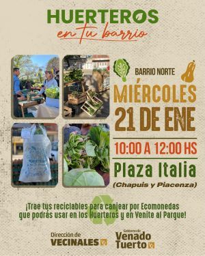 Este miércoles 21 de enero, de 10 a 12, se realizará en plaza Italia (Chapuis y Piacenza) un nuevo encuentro del programa feriante de la Dirección de Vecinales “Huerteros en tu barrio”.