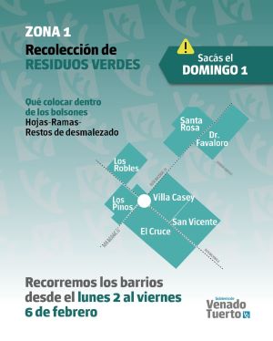 El Gobierno de Venado Tuerto, a través de la Secretaría de Servicios y Obras Públicas, informa el esquema de recolección de residuos verdes que se implementará del lunes 2 al viernes 6 de febrero.