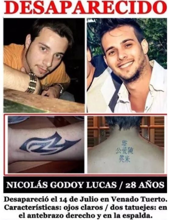 En realidad Nicolás Christian Godoy Lucas se ausentó desde su hogar (ubicado en la zona rural en el campo El Recuerdo, kilómetro 360,5 de ruta 8) el lunes 14, cuando se dirigió al centro de Venado Tuerto a realizar unos trámites bancarios en su vehículo Volkswagen Quatum modelo 94, color champagne. Luego se comprobó que a la tarde realizó una compra en la sucursal del Carrefour de Venado Tuerto. Pero sus familiares denunciaron su desaparición el miércoles, luego de tomar conocimiento de que en el Parque Industrial aparecieron dos perros bóxer que eran propiedad del joven. Se informó además que al momento de su desaparición Nicolás vestía pantalón negro jean, cinto blanco, remera de manga larga negra con cuello polo, saco negro de paño y calzaba botas de cuero marrón.