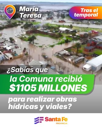 El Gobierno provincial, con el fin de reforzar la asistencia a la población de María Teresa tras el último temporal que ocasionó severas inundaciones concretó la entrega de fondos a la comuna local para realizar una serie de trabajos que ayuden a prevenir los riesgos a futuro.