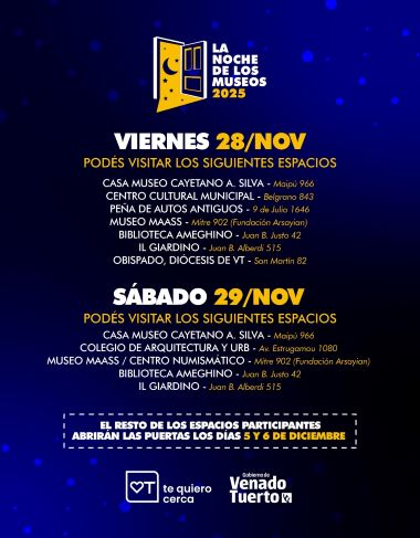 La mayoría de los museos, casas históricas e instituciones culturales y patrimoniales participantes han trasladado su programación al segundo fin de semana, abriendo sus puertas el viernes 5 y sábado 6 de diciembre, en el horario originalmente previsto de 20:00 a 00:00 horas. Esta reprogramación incluye al Archivo Histórico de Venado Tuerto, Biblioteca Alberdi, Radio Club VT, Teatro Verdi, VAIÚ Club del Aire, Museo Essen, Escuela Municipal de Teatro Musical, Museo Internacional de Arte (MIA), iglesias, centros sociales, espacios de memoria, talleres creativos, galerías e instituciones tradicionales, consolidando la edición 2025 como la más ambiciosa y completa hasta la fecha.
