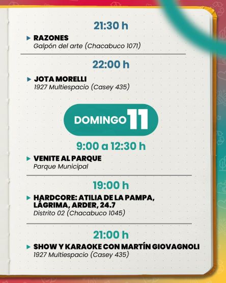 Este sábado, desde las 21, la plaza Italia (Chapuis y Piacenza), será escenario del ciclo de artistas locales Venado Folk. En esta noche el aporte musical estará a cargo de Érica Bustos, Cristian Ricardi, Liwen, Sentimiento Guitarrero, Eduardo Ricardo, y Cande y Giovana.