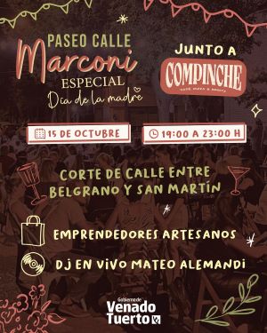 En vísperas del Día de la Madre, habrá un Paseo Callejero sobre avenida Marconi organizado por la Secretaría de Desarrollo Productivo a través de la Dirección de Emprendedurismo y Economía Social junto al bar Compinche, ubicado en la esquina de Marconi y San Martín.
