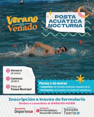 El viernes 9 de enero, desde las 20, se realizará en el natatorio del Parque Municipal la primera Posta Acuática Nocturna, como parte de la temporada 2026 de la agenda “Verano en Venado”, con la organización de la Secretaría de Territorialidad y Desarrollo Cultural a través de la Dirección de Deportes.
