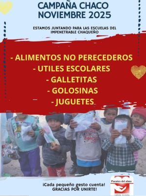 La ONG Puentes del Alma, con sede en Venado Tuerto, lanzó una nueva campaña solidaria destinada a las escuelas del impenetrable chaqueño. La iniciativa, programada para noviembre de 2025, busca reunir alimentos no perecederos, útiles escolares, galletitas, golosinas y juguetes, con el objetivo de acompañar a niños en situación de vulnerabilidad.