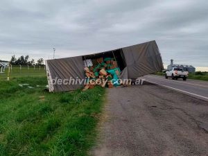 Un camión que transportaba agroquímicos despistó y volcó en la banquina ascendente de la Ruta Nacional n.º 5, a la altura del kilómetro 161,300, en jurisdicción de Chivilcoy.