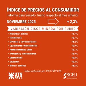 El relevamiento de precios que desarrolla el Centro de Estadísticas de la Facultad Regional para Venado Tuerto, registró 2,3 % para el mes pasado, acumulando así una suba interanual del 30,02 %.