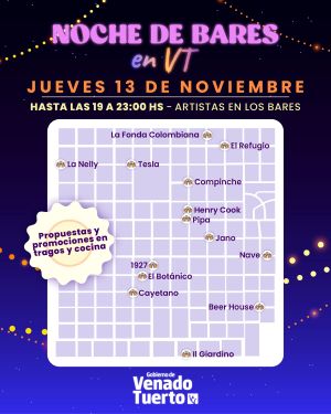 Este jueves 13 de noviembre el Gobierno de Venado Tuerto ofrecerá una nueva edición de la “Noche de bares”, con variadas propuestas y promociones en tragos y cocina, además de espectáculos con artistas locales.