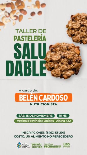 La nutricionista Belén Cardoso brindará un Taller de Pastelería Saludable el sábado 15 de noviembre a las 10 en la sede vecinal del barrio Provincias Unidas, Alsina 432, con el auspicio de la Dirección de Vecinales.