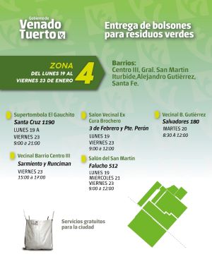 El Gobierno de Venado Tuerto, a través de la Secretaría de Servicios y Obras Públicas, informa el esquema de recolección de residuos verdes que se implementará desde el lunes 19 al viernes 23 de enero.