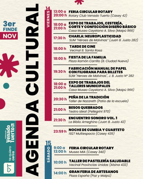 Un nutrido programa de propuestas presentará este fin de semana la ciudad de Venado Tuerto, comenzando este viernes con la Feria Circular Rotary, que se desarrollará de 13 a 20 en la Casa del Rotary Club Venado Tuerto (Casey 42). La actividad tendrá continuidad el sábado de 9 a 13.