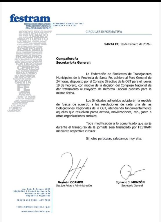 La Federación de Sindicatos de Trabajadores Municipales de la provincia de Santa Fe (Festram) confirmó su adhesión al paro general de 24 horas convocado por la Confederación General del Trabajo (CGT) para el próximo jueves 19 de febrero. La medida de fuerza, que se extenderá a lo largo y ancho del territorio santafesino, busca expresar el firme rechazo del sector municipal al tratamiento del proyecto de Reforma Laboral en el Congreso Nacional, iniciativa que consideran perjudicial para los derechos de los trabajadores.