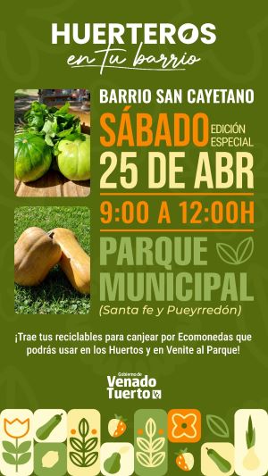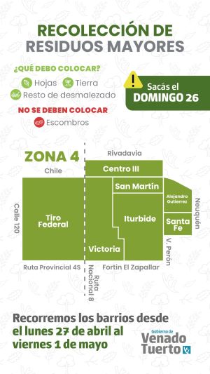El Gobierno de Venado Tuerto, a través de la Secretaría de Servicios y Obras Públicas, informa el esquema de recolección de residuos verdes que se implementará desde el lunes 27 de abril al viernes 1 de mayo.