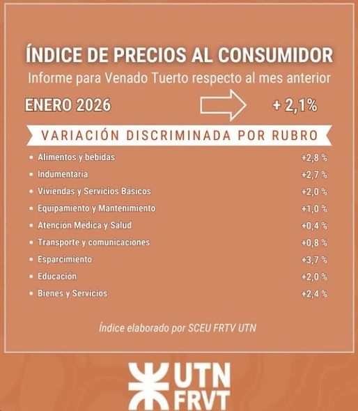 El Centro de Estadísticas de la UTN Venado Tuerto emitió el informe con el resultado del relevamiento del Índice de Precios al Consumidor sobre el primer mes de 2026 para nuestra ciudad, que se ubicó en 2,1 %, mostrando una leve desaceleración respecto del registro del mes previo. Con este resultado, la variación interanual del índice general se posiciona en 23,1 %.