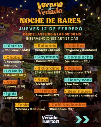 La "Noche de Bares" se ha convertido en un clásico del verano venadense, gracias a su fórmula que fusiona la oferta gastronómica local con una variada programación artística. En esta edición, los asistentes podrán disfrutar de promociones especiales en cada uno de los 17 locales adheridos, así como de música en vivo e intervenciones artísticas. Para generar un ambiente más amplio y cómodo, en algunos puntos de la ciudad se implementarán cortes de calle y ampliaciones de veredas frente a los bares. Entre los establecimientos participantes se encuentran El Refugio, La Nelly, Tesla, Compinche, Henry Cook, Nave, Cayetano, Beer House, Pausa, Chabal, Ignis, Il Giardino, Bohemio, Distrito 02, Café Noviembre, Atlas y Deleites.