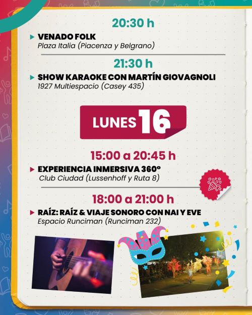 La música tradicional también tendrá su espacio este domingo en la ciudad con “Venado Folk” en la plaza Italia (Piacenza y Belgrano). A partir de las 20.30 subirán al escenario Omar Olmedo, Vale Cuerzola, Juani López, Cecilia Pennessi, Brujo Sachero y la Escuela de Malambo Alejandro Serrano.