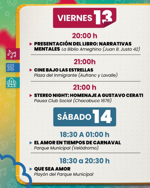 La agenda local para este fin de semana, caracterizado por el feriado de Carnaval, comienza este viernes con la presentación del libro “Narrativas Mentales” de María Celeste González. El lugar de encuentro será la Biblioteca Florentino Ameghino (Juan B. Justo 42), a las 20.