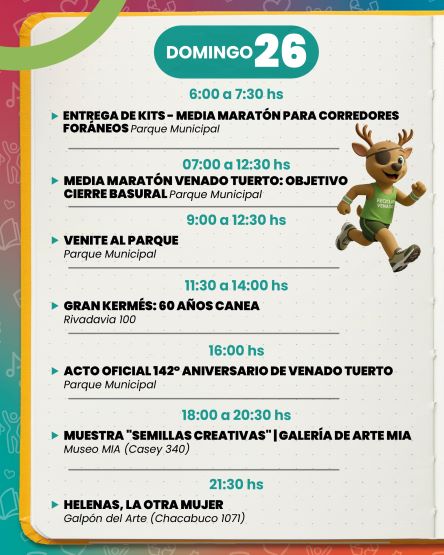 En la mañana del domingo, de 6 a 7.30, se realizará la entrega de kits para los competidores foráneos de la Media Maratón Venado Tuerto. La actividad se realizará en el Parque Municipal General Belgrano.