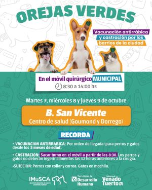 La Secretaría de Desarrollo Humano informa que el Instituto Municipal de Salud y Convivencia Animal (Imusca) estará con el programa gratuito “Orejas verdes” en el barrio San Vicente.